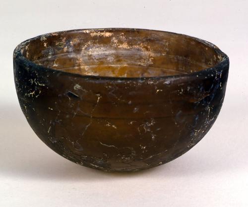 DescriptionThis hemispherical bowl is made of golden-brown glass. It has a vertical rim with a slightly rounded edge, a smoothly curving convex side, and a convex bottom. Two narrow horizontal grooves are cut in a band inside the bowl below the rim. The surface was finished by sagging, rotary polishing on the interior and the top and outside of the rim, and fire-polishing on the rest of the exterior. The interior grooves were cut after forming.