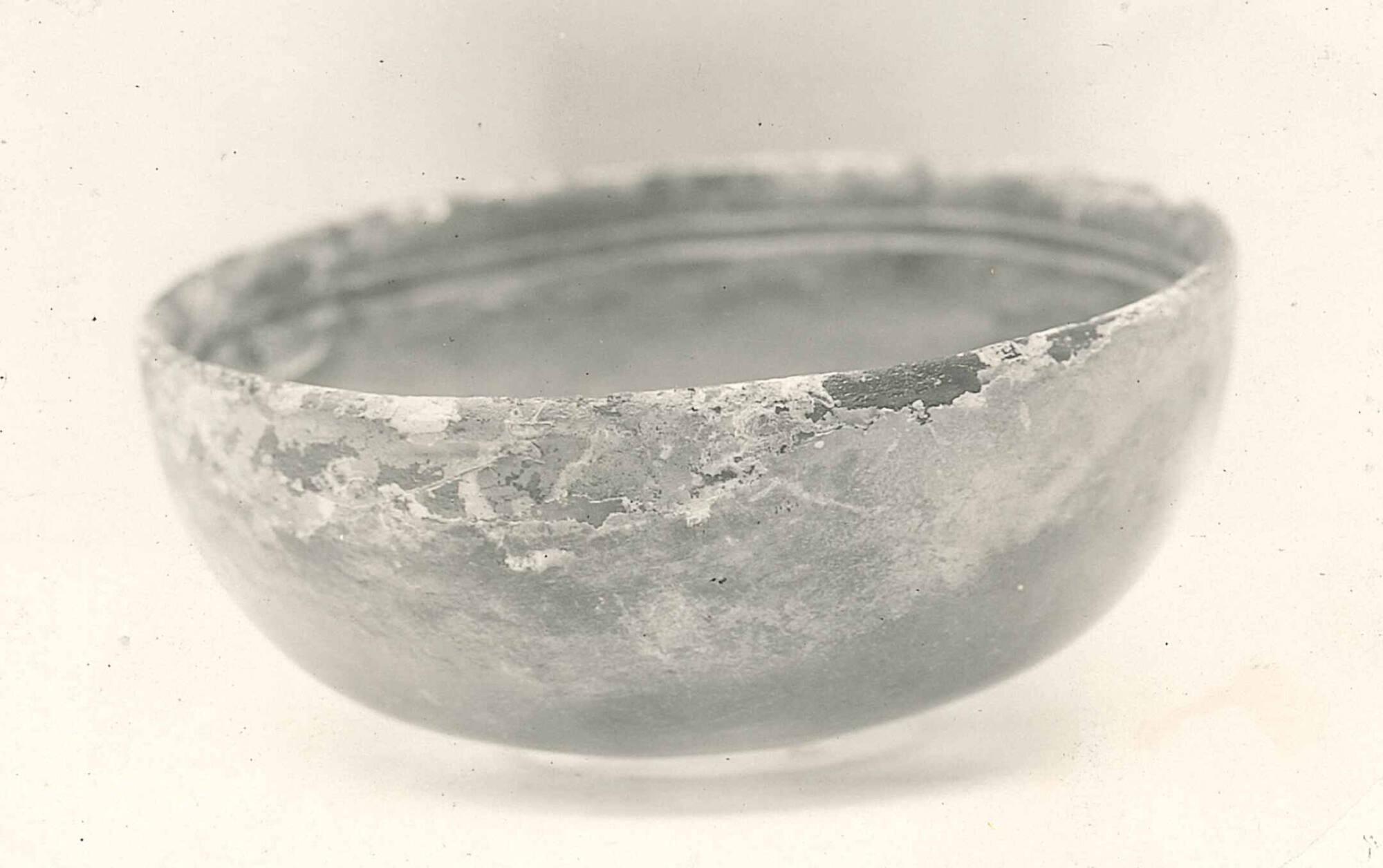 DescriptionThis small bowl was made from clear glass streaked with purple. It was shaped with heat and polished by hand. Carved grooves decorate both the inside and the outside surfaces.