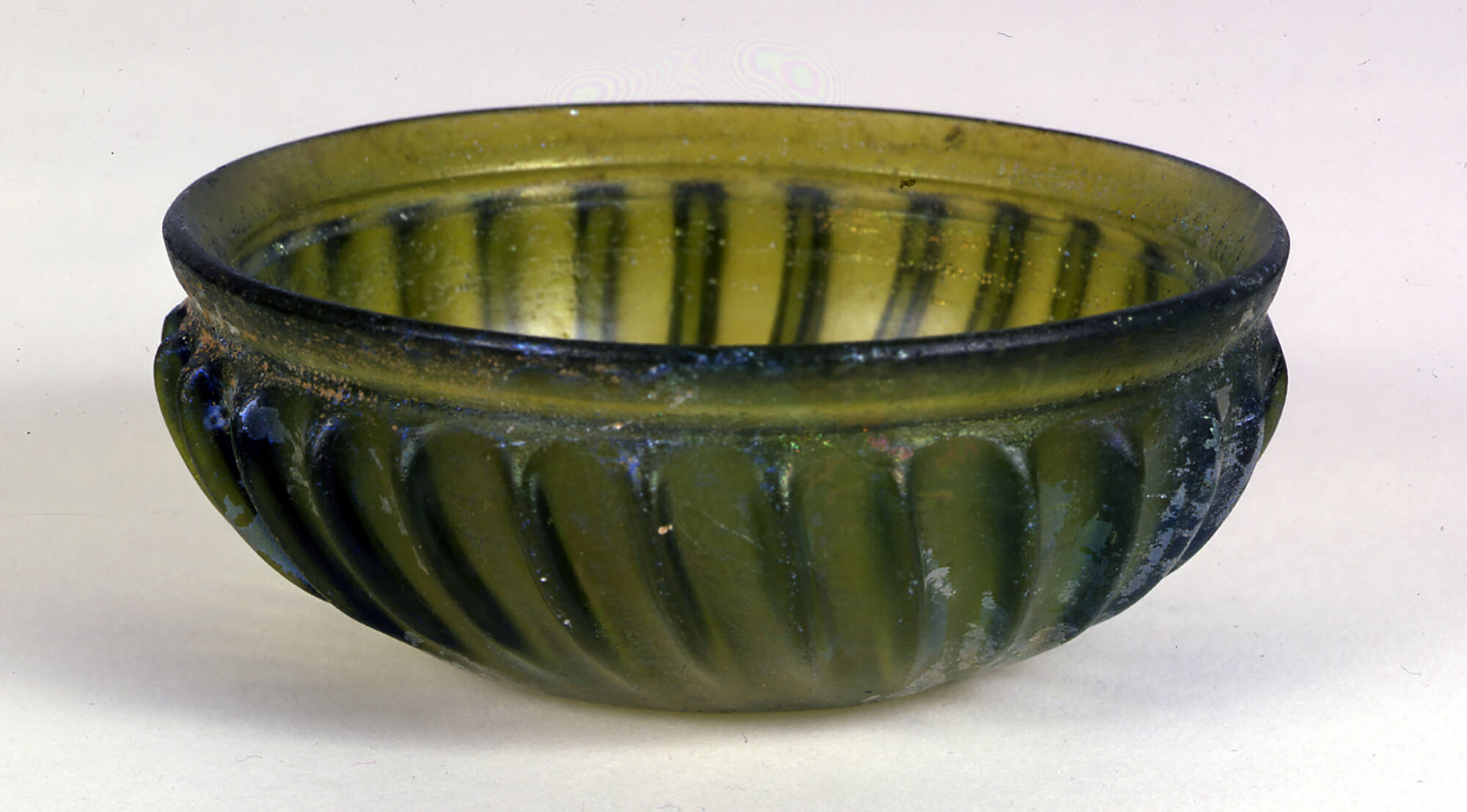 DescriptionBroad, shallow ribbed bowl made of dark yellowish-green glass. The bowl was sagged, then rotary-polished on the interior, the top, and the outside of the rim and across the tops of the ribs, while the rest of the exterior is fire-polished and the interior is cut. It has a sharply outsplayed rim with an almost pointed edge that slopes diagonally inward, a convex curving side, and a slightly concave bottom. On the interior, a wide, pronounced horizontal groove is cut at the junction of the rim and side. On the exterior, twenty-nine narrow but pronounced ribs are set at varying angles around the body and extend almost to the junction of the side and bottom.