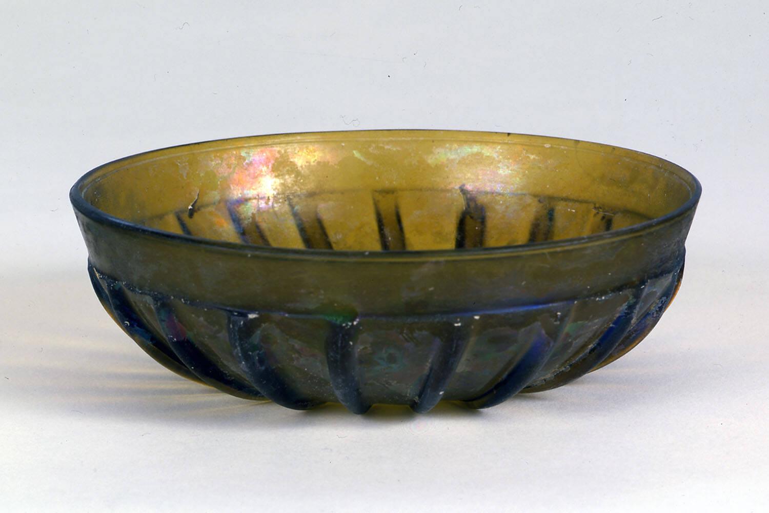 DescriptionBroad, shallow ribbed bowl made of golden-brown glass. The vessel was sagged, then rotary-polished on the interior, the top, and the outside of the rim and across the upper ends of the ribs, with the rest of the exterior fire-polished and the interior cut. It has an upright rim with an almost flat edge that slopes obliquely outward, a convex curving side, and a slightly concave bottom. On the interior, four narrow horizontal grooves include one just below the rim, two in a band at the junction of the side and bottom, and a small circular groove at the center. On the exterior, twenty pronounced ribs are set almost vertically on the body and end beyond the junction of the side and bottom.