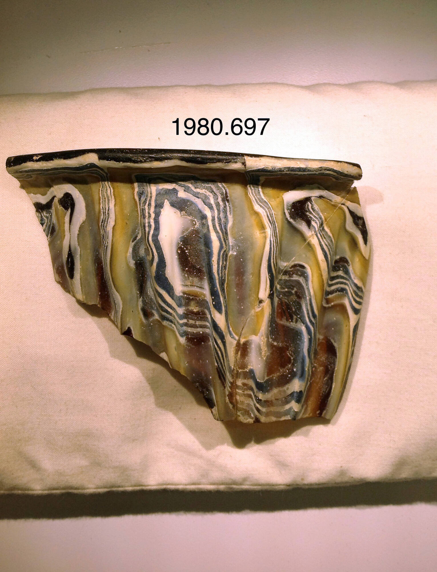 DescriptionThree joining fragments of rim and side of deep, footed ribbed bowl. Outsplayed rim with thick, rounded edge; convex curving side. Spiraling mosaic pattern formed from large rectangular sections of a single cane in a golden-brown ground with an opaque white spiral and a second spiral composed of four parallel blue threads set among four thin opaque white threads. On the exterior, numerous close-set, rounded ribs arranged vertically on the body; some ribs extend to the rim, others to the upper part of the body.