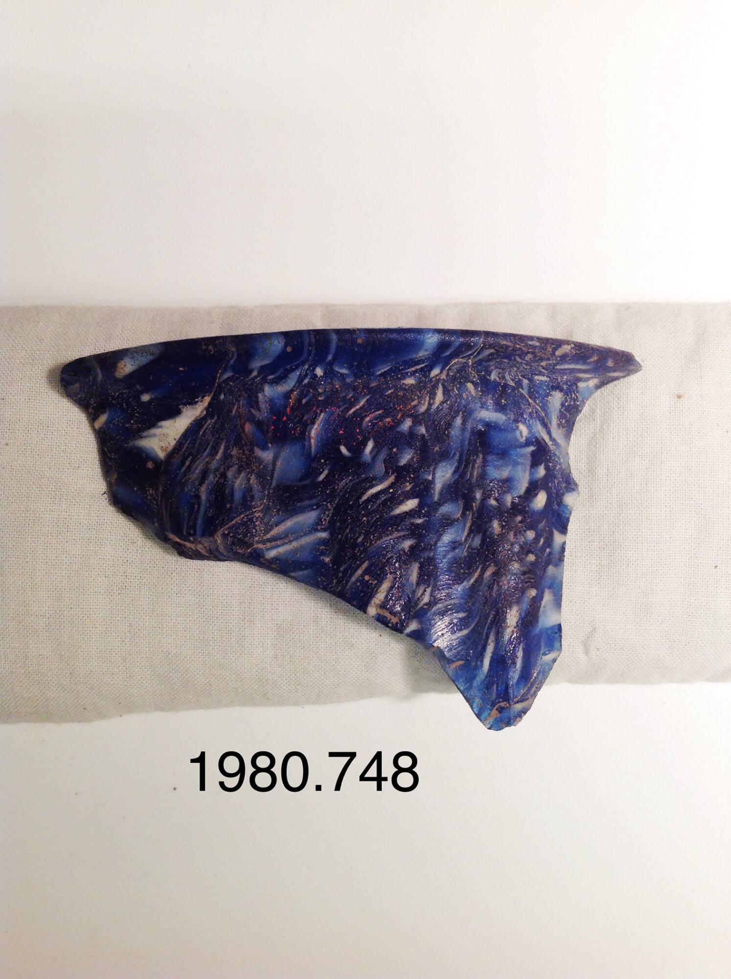 DescriptionFragment of rim and side of deep, footed ribbed bowl. Horizontal rim with rounded edge; almost vertical side with a slight downward curve. Marbled mosaic pattern formed from polygonal sections of a single cane in a blue ground with numerous opaque white rods. On the exterior, broad flat ribs set vertically on the body; the ribs extend almost to the rim.