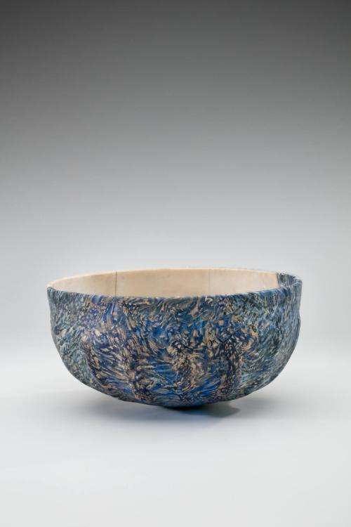 DescriptionThis object consists of eleven joining fragments from the rim, side, and bottom of a large ribbed bowl. It has an almost vertical rim with a flat edge, a convex curving side, and vestiges of a flat or slightly concave bottom. The exterior features widely spaced, broad, rounded ribs set obliquely on the body, extending from the shoulder to the lower part of the vessel. The bowl’s composite mosaic pattern is made from polygonal sections cut from a single cane in a blue ground with numerous opaque white rods. The vessel was mold fused, tooled, and abraded. It was assembled from cane sections and cast, then rotary-polished.