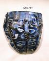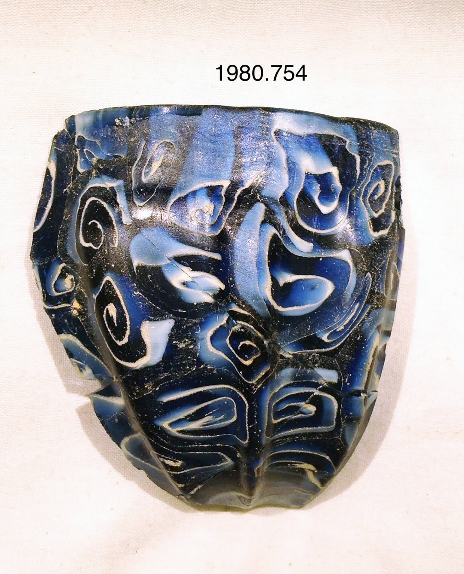 DescriptionFour joining fragments of rim and side of ribbed bowl. Slightly outsplayed rim with rounded, out-turned edge; flaring shoulder; convex curving side. Composite mosaic pattern formed from polygonal sections of a single cane in a blue ground with an opaque white spiral. On the exterior, evenly spaced rounded ribs set vertically on the body; the ribs extend from the shoulder to below the bottom.