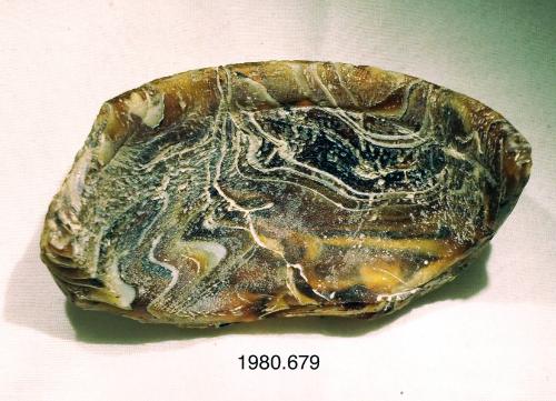 DescriptionMarbled mosaic pattern formed from polygonal sections of a single cane in a golden-brown ground with wavy opaque white streaks.