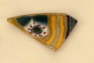 DescriptionStriped quadripartite pattern formed from lengths of at least four differ-ent canes, each laid in pairs at right angles in each of four triangular quadrants. From the top to the bottom of the preserved quadrant, a large wedge-shaped section with two blue