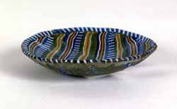 DescriptionThis small lens-shaped dish was made using the mosaic glass technique and mold-fused construction. It has an upright rim with a rounded edge, an uneven, shallow convex side, and a shallow convex bottom. The dish features a striking striped mosaic pattern formed by laying lengths of two alternating colored canes side by side in parallel rows, each separated by a single blue network cane wound spirally with an opaque white thread. One composite cane has narrow opaque red strips flanked by opaque white lines, with a central narrow opaque yellow length bordered on one side by a blue strip. The other composite cane has narrow opaque yellow strips outlined by opaque white lines, a central opaque red strip, and wider green strips on the outside. This pattern is repeated five times around the dish. The colors of the canes do not run through the full thickness of the glass but are backed by a continuous layer of greenish glass on the exterior. A blue network cane wound with an opaque white thread forms the rim.