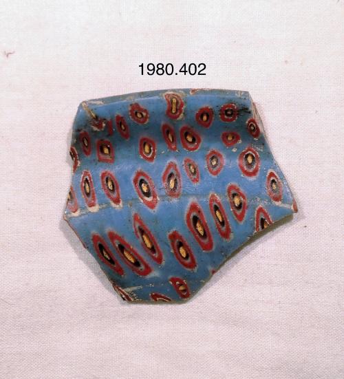 DescriptionComposite mosaic pattern formed from polygonal sections of a single cane in an opaque light blue ground with concentric circles of opaque red, opaque white, and purple around a central opaque yellow rod.
