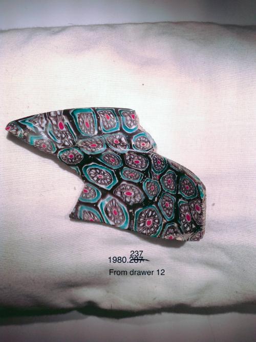 DescriptionComposite mosaic pattern formed from polygonal sections of a single cane in a purple ground with concentric circles of opaque white, blue, and opaque white surrounding a circular cluster of wedge-shaped opaque white rods, each outlined in pur-ple, with a