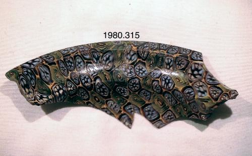 DescriptionComposite mosaic pattern formed from polygonal sections of two canes: the first in a purple ground outlined in opaque yellow, surrounding a circular cluster of opaque white rods set in purple, the entire cluster outlined by an opaque white circle; the sec