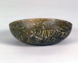 DescriptionThis broad, shallow bowl has an upright rim with a rounded edge, a convex curving side, and a slightly concave bottom. Its surface displays a marbled mosaic pattern formed from polygonal sections cut from a single cane in a golden-yellow ground with numerous opaque white rods. On the interior, three narrow horizontal grooves are present: two form a band at the junction of the side and bottom, and one small circular groove sits at the center of the base. The bowl was assembled from sections of cane, cast, rotary-polished on the interior and rim, and cut on the interior.