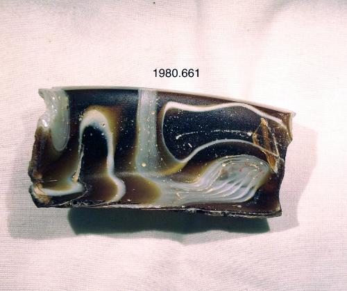 DescriptionMarbled mosaic pattern formed from large polygonal sections of a single cane in a golden-brown ground with curvilinear strips and threads of opaque white.