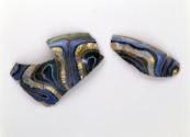 DescriptionGold-band mosaic pattern formed in the following order from serpentine lengths of canes in golden-brown, dark blue backed by opaque white and outlined on one edge by purple, colorless encasing shattered gold leaf, golden-yellow with streaks of opaque whit