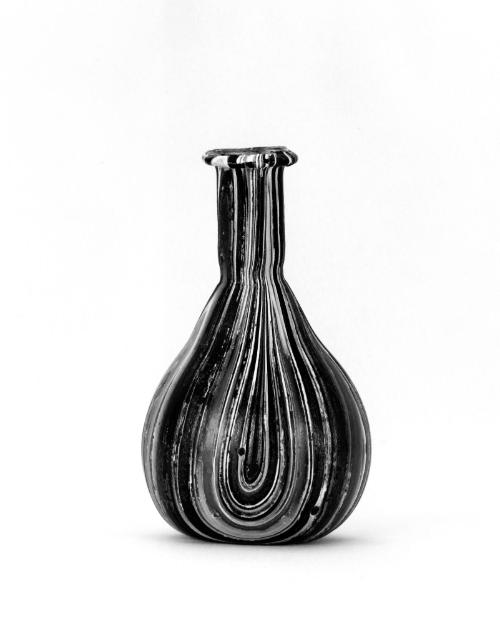 DescriptionTall bottle with an outsplayed rim and a closed, cut-out tubular ledge below an upright lip. The vessel has a tall, narrow cylindrical neck, a piriform body with convex sides, and a slightly concave bottom. It features a striped mosaic pattern composed of vertical lengths of two different canes: one in a dark blue ground with opaque white parallel lines; the other, represented by only two lengths, in a colorless ground with blue, opaque white, and pale purple parallel lines. Each cane begins on one side of the rim, extends downward over the body and across the base (becoming progressively wider), and continues upward on the other side, ending at the opposite side of the rim.