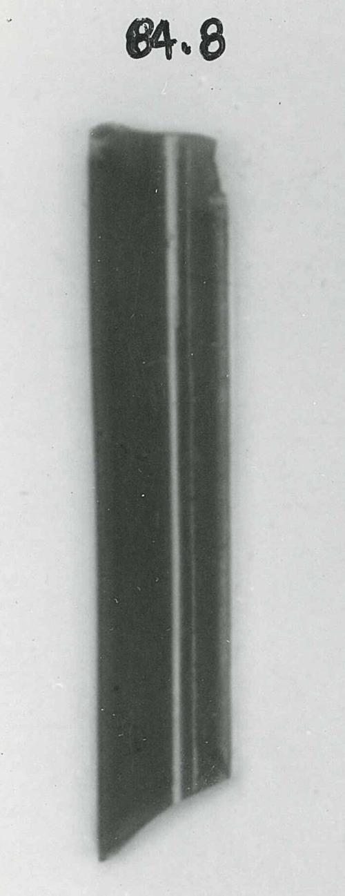 DescriptionFragment of straight border molding. On the upper surface, a thin layer of blue with two central opaque white lines with a backing of dark blue flanked on either side by strips of opaque white. Upper- and undersides flat; vertical edges.