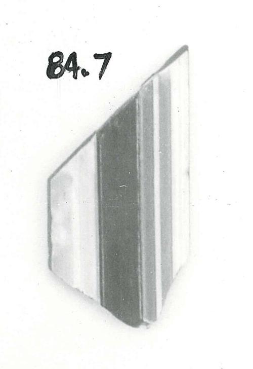 DescriptionFragment of straight border molding, one edge cut diagonally. On the right, a thin strip of opaque white backed by dark blue; next to it, a thin strip of pale blue with an opaque white line over a layer of opaque white backed by dark blue; next, a strip of dark blue backed by opaque white; to the left, a thin layer of opaque white backed by dark blue. Upperside flat but uneven; underside flat; smooth vertical edges.