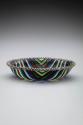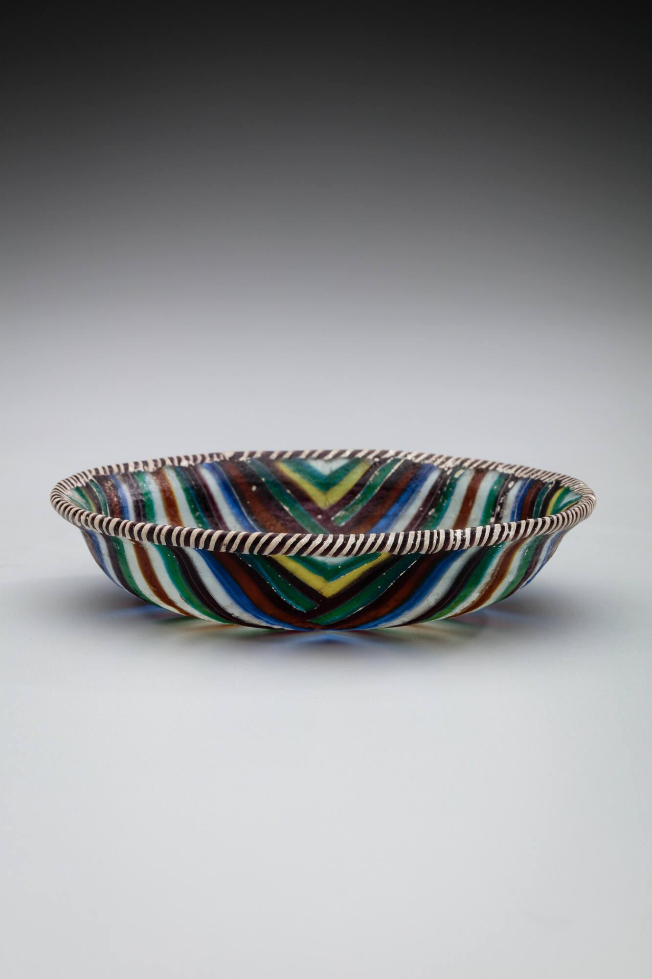 DescriptionBroad, shallow bowl. Slightly outsplayed rim with uneven, rounded edge; convex curving side; uneven, flat bottom. Striped quadripartite pattern formed from lengths of ten canes laid in pairs at right angles in each of four triangular quadrants. At the top of each quadrant, a wedge-shaped length of opaque white encased in colorless; a length of green encased in colorless; a length of opaque yellow encased in colorless; a composite cane with a central green length flanked by strips of purple, each encased in colorless; a length of opaque orangish-brown; a length of blue encased in colorless with a thin opaque white line; a length of opaque white encased in colorless; a length of purple encased in colorless with a thin opaque white line; a length of green encasing opaque yellow encased in colorless; a second length of opaque white encased in colorless; and a length of opaque orangish-brown encased in colorless, with a square section of blue (with an opaque yellow line) as the intersection of the quadrants. A purple network cane wound spirally with an opaque white thread is attached as a rim.