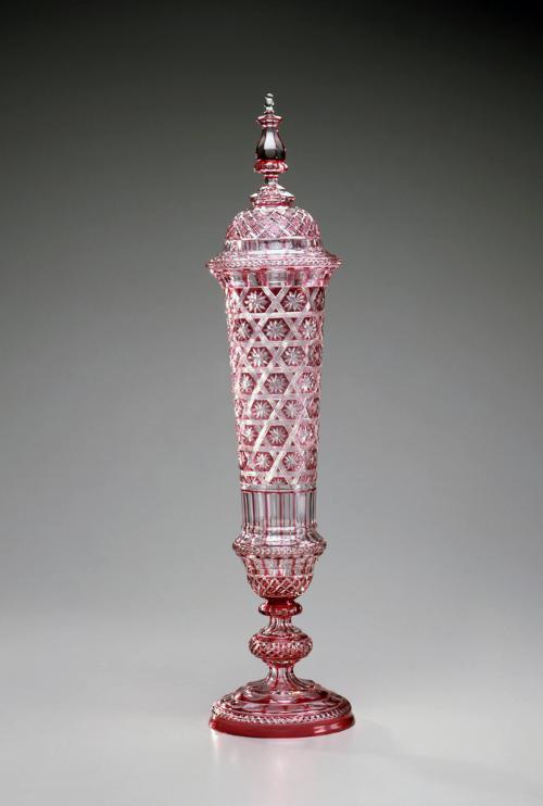 Vase: body blown and finished by tooling. Joined directly to a blown and tooled base that is one continuous piece, with a hollow interior up to the join with the body. Cover: blown and finished by tooling. Applied knop. Rim of cover, rim of body, and rim of base ground and polished. No pontil mark on either the base or the cover. The piece is cut over its entire surface, very precisely, through the layer of ruby casing.