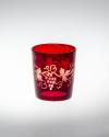 DescriptionColorless non-lead glass; blown in a turn mold. Rim sheared and fire-polished. Shallow, concave base with flat outer rim ground and polished. No pontil mark. Exterior and rim stained, probably with copper nitrate, then fired. Sketchily engraved with stone wheels with a pattern of grapes and grape leaves.