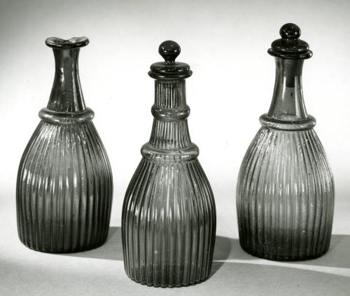 DescriptionAmethyst colored glass. Blown in the same mold (McKearin G.I-7, Type 2) and in the same manner as 1917.181. Interior of neck rough-ground to receive a stopper. Rough pontil mark.