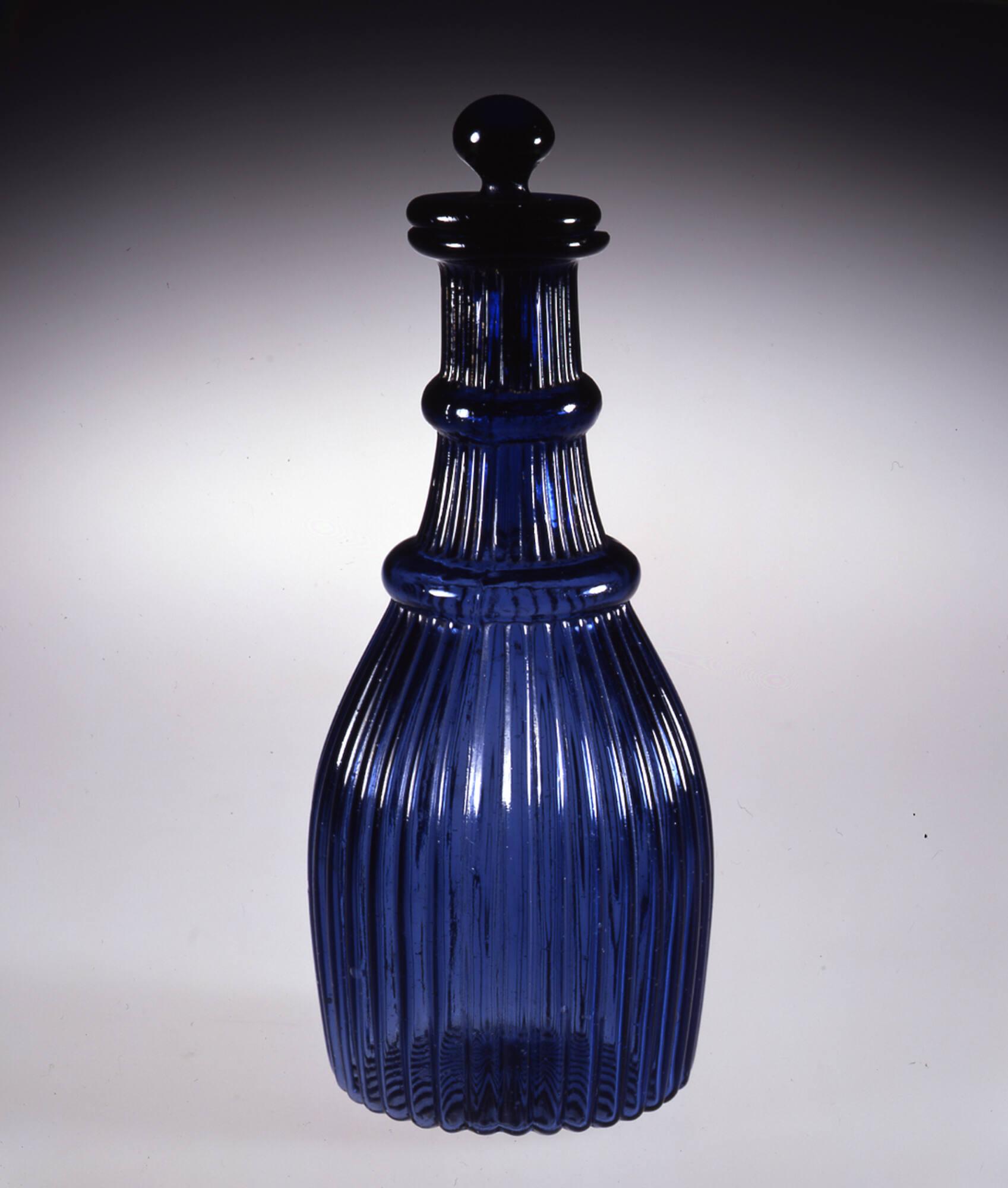 DescriptionPurplish-blue colored glass. Bottle: blown in a mold (McKearin G.I-7, Type 4) of three vertical sections and a base plate (McKearin Rayed Type I). The entire bottle, including the flange lip, formed by the blow-over and crack-off process. Upper surface of the lip ground flat and semipolished.