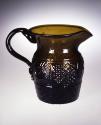 DescriptionOlive-amber bottle glass. Blown in a mold (McKearin G.III-16) for a decanter of three vertical sections and a base plate (McKearin Rayed Type VII.A). Neck, rim, and spout sheared and tooled to shape. Applied solid handle with crimped lower end. Rough pontil mark in concave center of base.