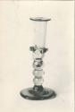 DescriptionPale green. Lip, long socket, and stem blown and tooled from same gather. Applied band of wavy decoration around lower part of socket. Applied slightly sloping foot. Rough, solid pontil mark.