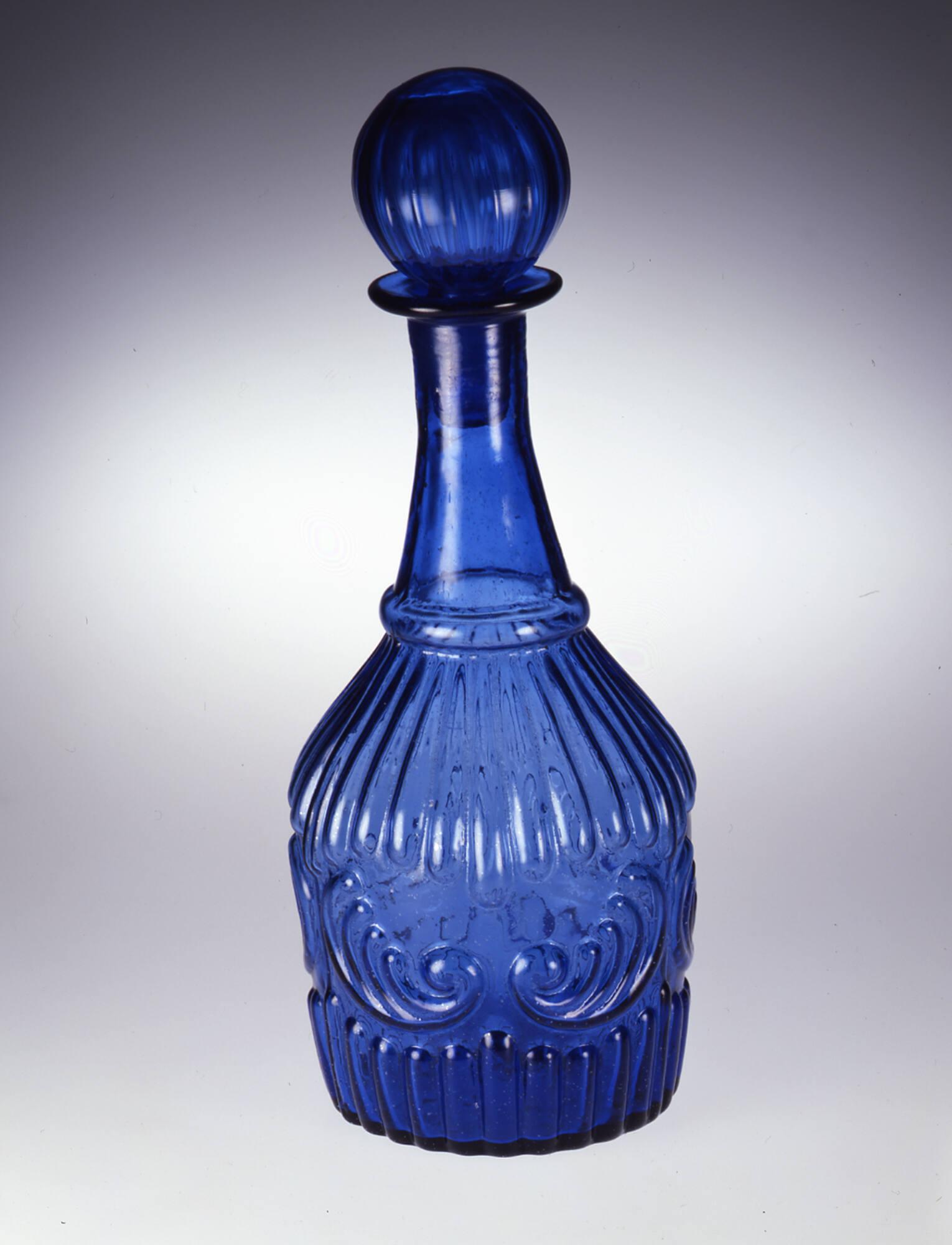 DescriptionSapphire-blue lead glass; blown in a full-size mold.