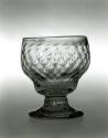 DescriptionDouble-ogee bowl blown in a part-size mold, probably of two pieces, patterned with seven rows of twenty-four small diamonds, the top and bottom rows distorted by manufacture. Joined by a solid band of vertical ribs drawn out from the bottom of the bowl to an applied and tooled, slightly sloping, circular foot. Rough, solid pontil mark on the almost flat base.