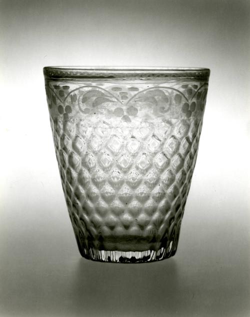 DescriptionPatterned with twenty-four pointed-arch flutes extending 1.8 cm (11/16 in.) above the base, seven rows of twenty-four elongated diamonds in the middle, and a plain area above. Blown in a mold, possibly a one-piece dip mold. Plain, slightly concave base. Traces of a partly rough pontil mark surrounded by rough-ground, unpolished area. Engraved with stone wheels with a band of stylized foliate motifs between a "squiggle" band at the rim and the top of the molded pattern.
