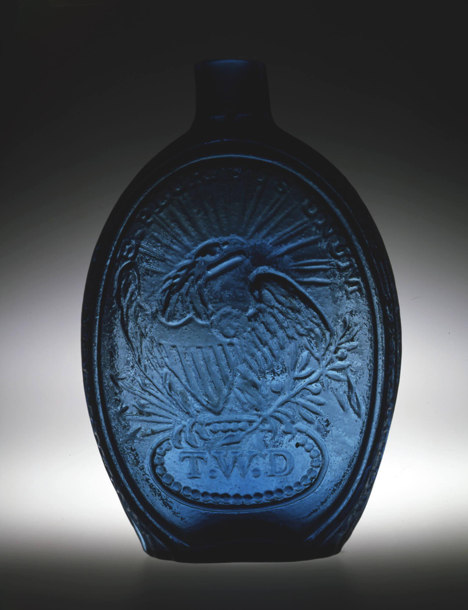 DescriptionDeep blue. Blown in a full-size two-part mold (McKearin G.I-14) that formed body and base. On the obverse: a three-quarter profile bust of George Washington in uniform. On the reverse: an American eagle with rays above and grasping an oval cartouche in its talons. The base is plain except for a moldmark and a rough pontil mark.