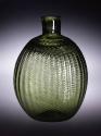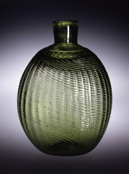 DescriptionLight yellowish green coloring. Made by the half-post method: patterned in a dip mold with 36 vertical ribs. Removed, twisted to the left, and reinserted in the mold to create a broken-swirl pattern. Blown, expanded, and tooled to shape. Rough pontil mark.