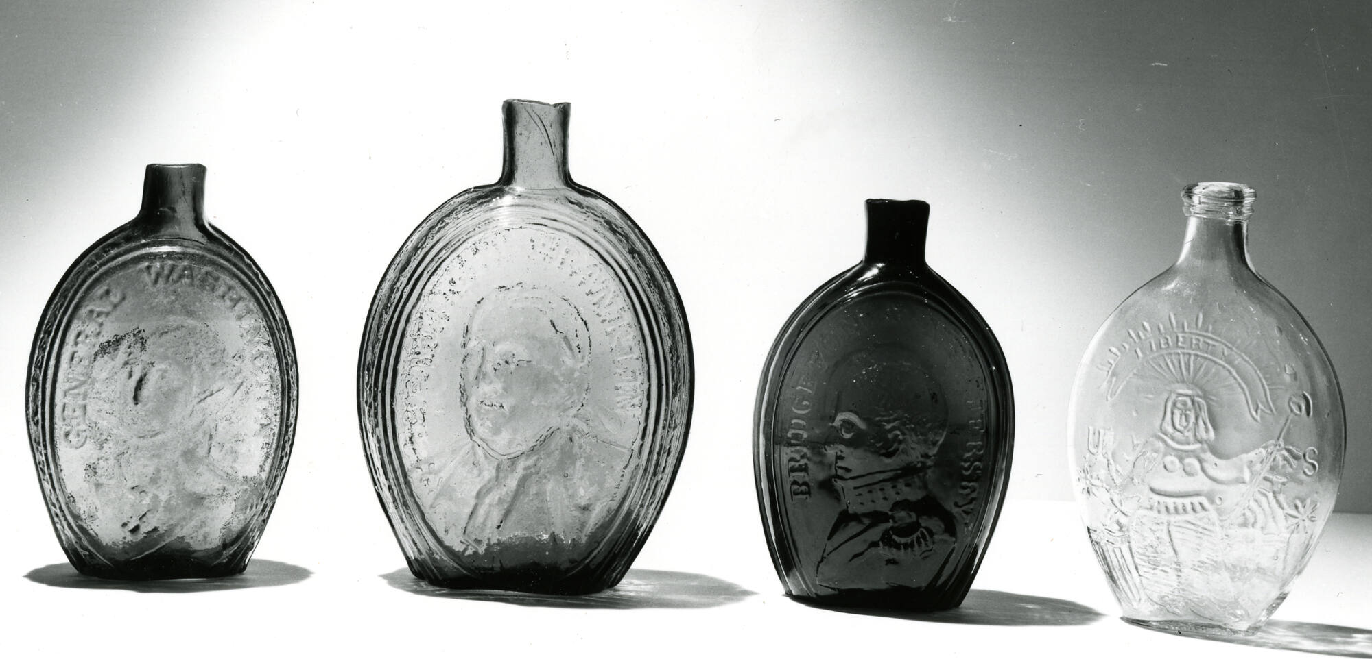DescriptionDeep olive-amber bottle. Blown in a full-size two-part mold (McKearin G.I-24) that formed body and base. On the obverse: a profile bust of George Washington in uniform. On the reverse: a profile bust of Zachary Taylor in uniform. The base is plain except for a moldmark offset toward the reverse that joins the two medial ribs and a rough, open pontil mark.