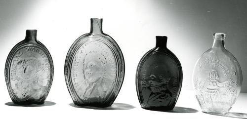 DescriptionLight bluish-green glass. Blown in a full-size two-part mold (McKearin G.X-23) that formed body and base. On the obverse: Liberty seated with a shield on the ground to the left supported by her right hand and a liberty cap on a pole held up by her left hand, with rays and a banner above. On the reverse: a log cabin, a pump, and a tree. Double-ring collar applied and finished with a tool. The slightly concave oval base is plain except for an almost imperceptible moldmark and a small nipple at the center.