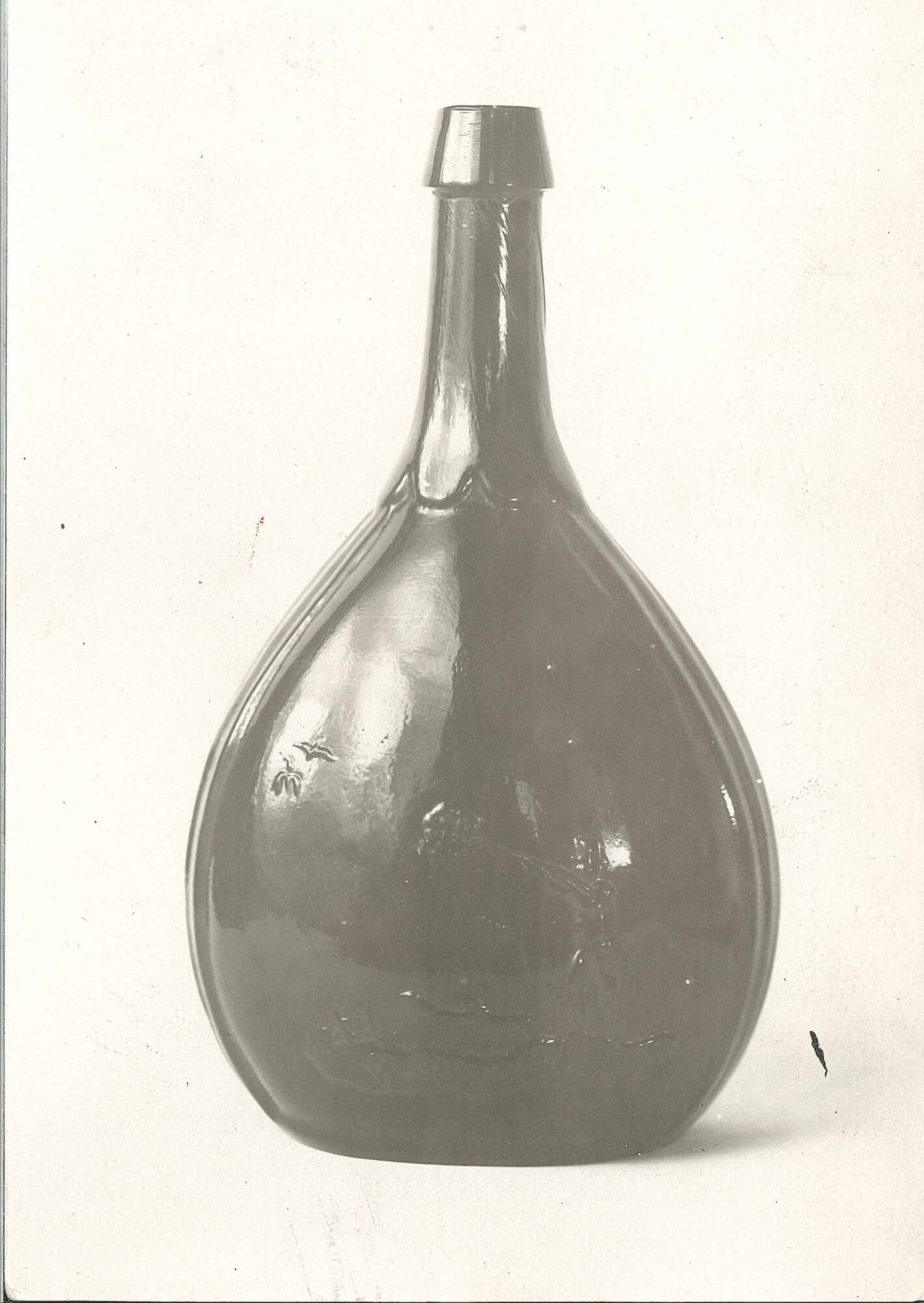 DescriptionDeep reddish brown coloring. Blown in a full-size mold (McKearin G.XIII-4) of two vertical sections that formed the body and the broad basal ring and a base plate that formed the central kick-up. On the obverse: two running dogs and a hunter shooting two ducks. On the reverse: a fisherman and a mill in the background. Broad, sloping collar applied and shaped by a lip-forming tool. The base is plain except for extensions of the side moldmarks through the broad basal ring to a plain, fairly high kick-up with a small nipple in the center. Black iron-oxide pontil mark.