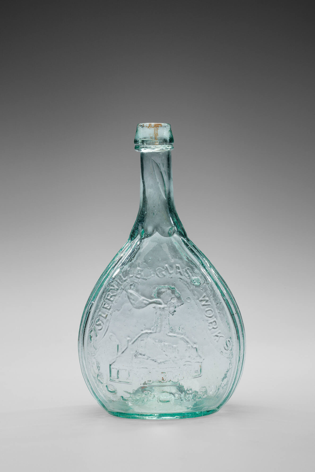 DescriptionLight aquamarine coloring. Blown in a full-size mold (McKearin G.I-107) of two vertical sections that formed the body and the very wide basal ring and a base plate that formed the central kick-up.
