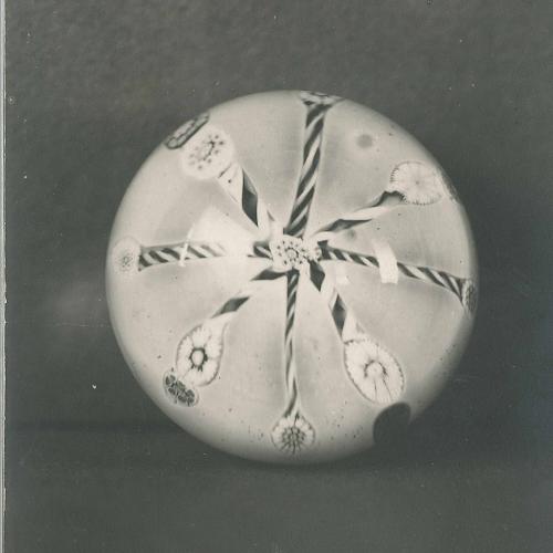 Solid, tooled. Encloses a milky white ground embedded with four lengths of canes crossing each other in the middle, with one millefiori cane in the center. The canes are spirally twisted red and opaque white, two each of different rods. The ends of the alternate canes terminate in two millefiori canes and one millefiori cane of assorted colors. Irregular concave pontil mark, polished, surrounded by flat, polished basal ring.
