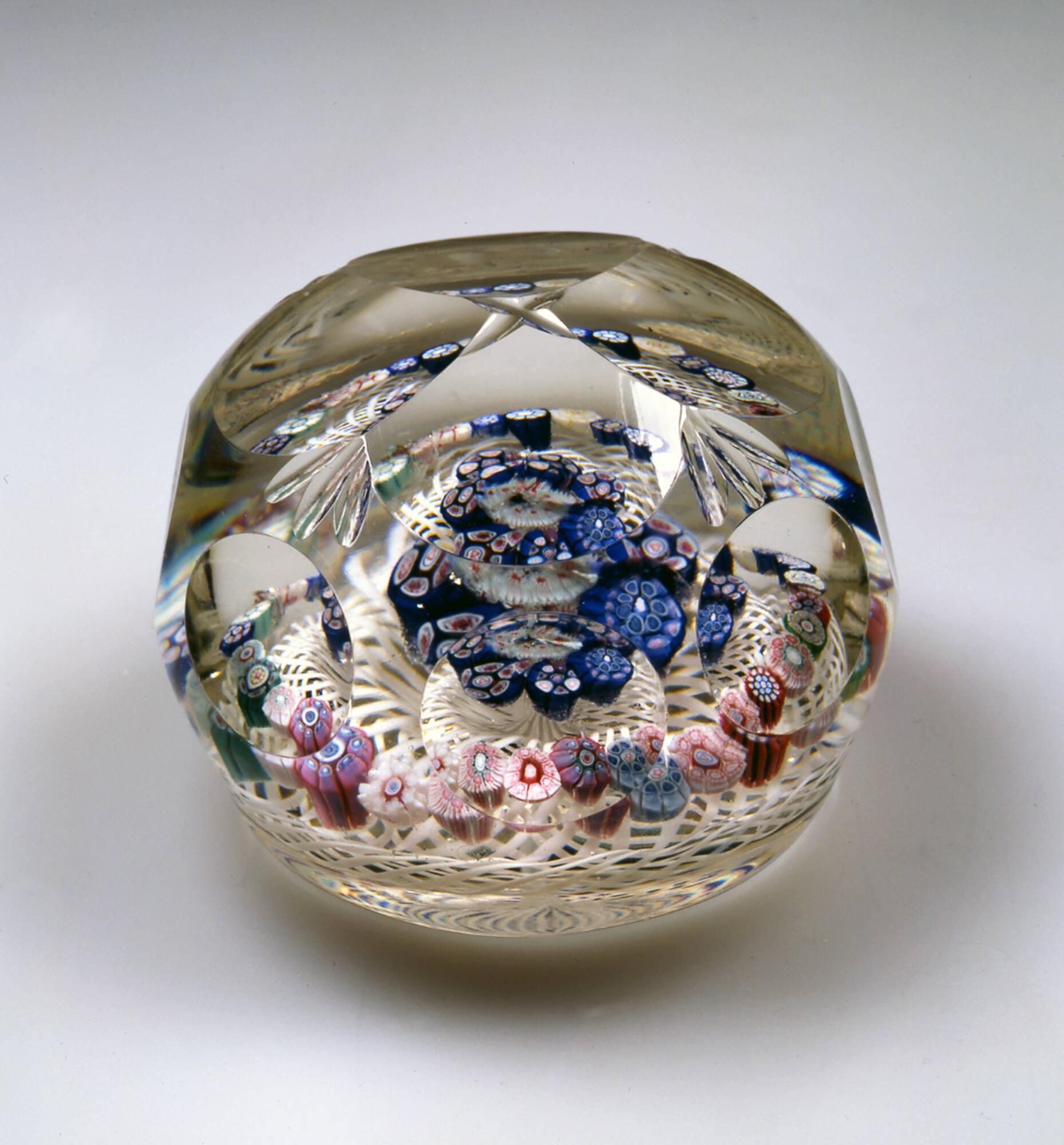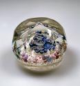 DescriptionSolid, tooled. Encloses a predominantly white cane at the center on a filigree ground, surrounded by two open concentric circles of millefiori canes, the outer circle of assorted colors, the inner circle of seven red, white, and blue canes. Side cut with eight printies, top cut with quatrefoil. Large, concave, polished pontil mark.