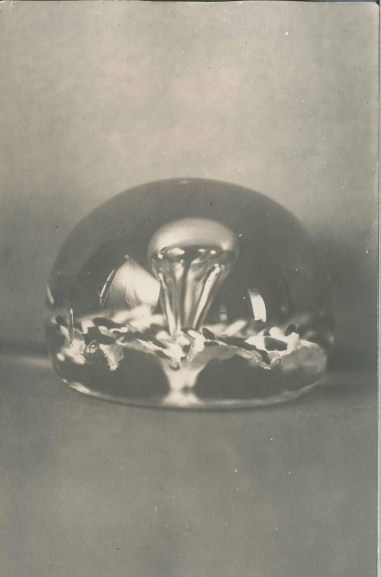 DescriptionSolid, except for a large bubble in the center extending to near the base, tooled. Encloses a stylized flower composed of opaque white bearing a variety of colored-glass chips, including blue, red, green, pink, and yellow, crimped to form six ruffled petals. Flat base rough ground.