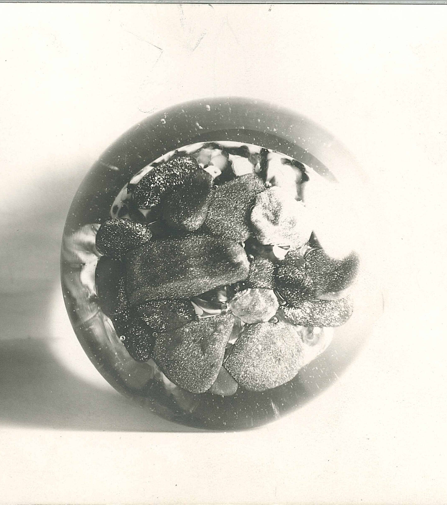 DescriptionColorless lead glass with a greenish tinge; solid, tooled. Encloses a mushroom pattern composed of chips of white, yellow, green, and blue with large irregular chips of aventurine (goldstone) superimposed. Flat base ground and polished.