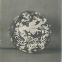 DescriptionColorless non-lead glass with a greenish cast. Solid, tooled. Encloses a flying dove, a church, a house, and the inscription, made of white frit picked up from a steel die engraved with the decoration, over a ground of chips of white, yellow, and orange-red glass. Large, rough pontil mark.