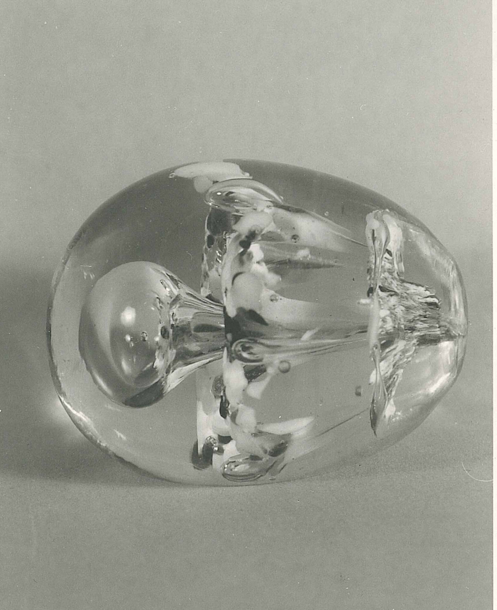 DescriptionColorless non-lead glass with a greenish tinge; solid, except for a large central stamen bubble and four smaller bubbles around the periphery, tooled. Egg form. Encloses two layers of multicolored chips of glass punched to form a stylized flower. One side cut flat and polished to form base.
