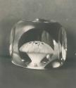 DescriptionSolid, tooled. Encloses a mushroom pattern around a central large red-and-white crimped cane with a white ropelike circle in its center, surrounded by two outer rings of white millefiori canes around a single inner ring of red-and-white crimped canes. All the canes are drawn down to form the mushroom; the lower ends of the columnar stalk extend almost to the large, deep, concave polished pontil mark. Top cut with one large round printie, side cut with five printies.