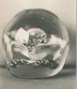 DescriptionSolid, except for a large bubble stamen in the center and four small bubbles around the periphery, tooled. Encloses a stylized flower of four large petals of pink-over-white glass with chips of red, white, and blue scattered on the pink, on a background of chips of red, white, and blue glass.