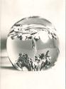 DescriptionColorless glass of good quality; solid, except for a center bubble, tooled. Encloses a stylized flower composed of swirling bands of red, white, and blue glass chips, the stem rising from a quatrefoil ruffled form of the same-colored chips.