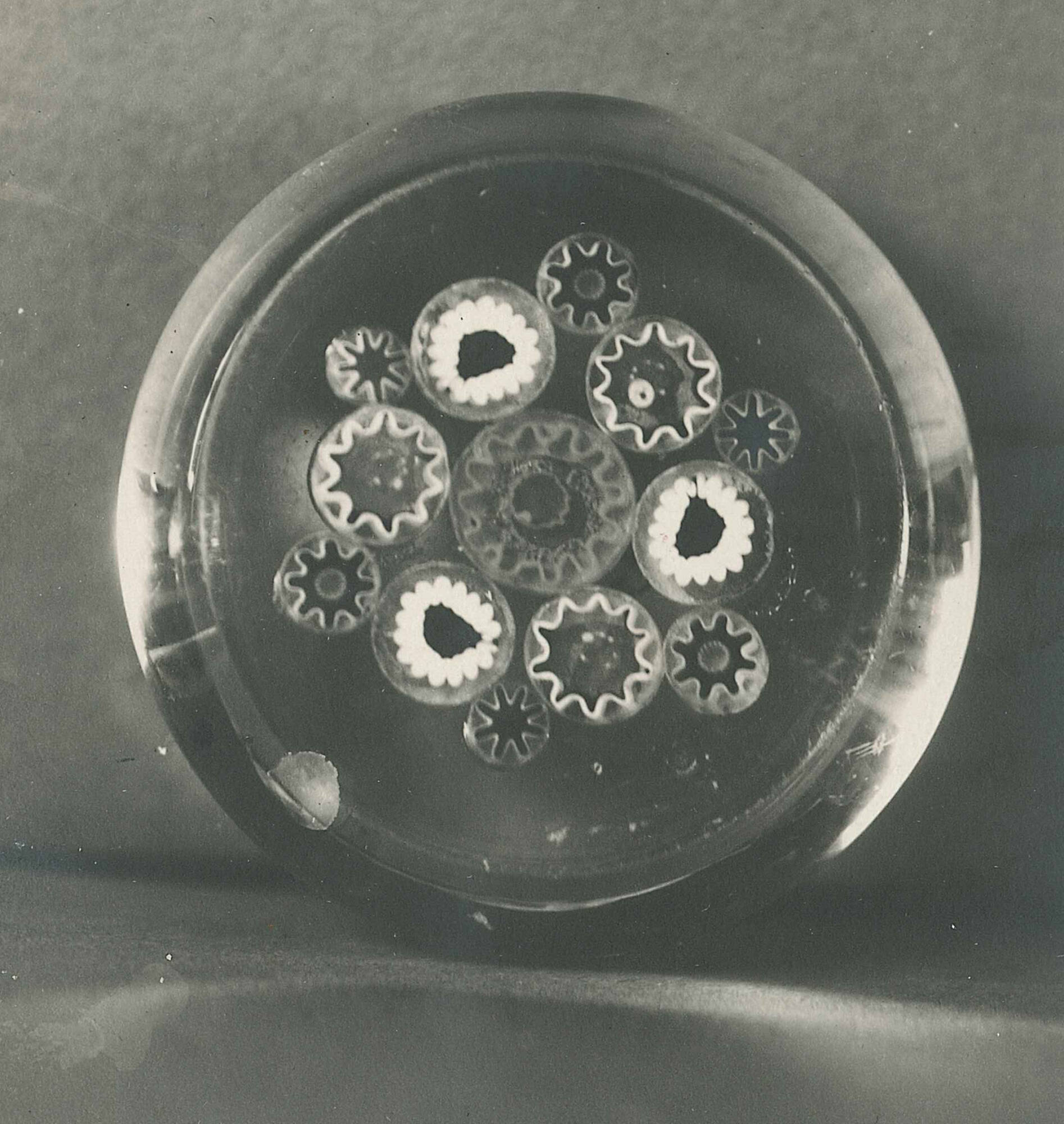 Solid, tooled. Dome with broad, slightly concave, polished base to which twelve glass millefiori canes have been glued. Canes polished on underside.