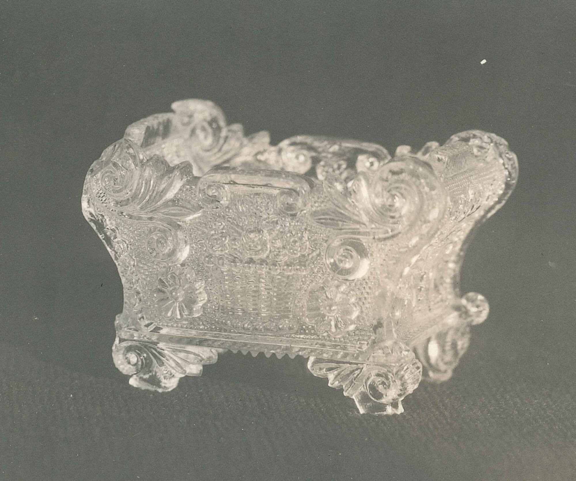 DescriptionPressed upright in a female mold of four vertical sections, bearing the pattern for the sides and ends, with a base plate bearing a pattern of triangular ribs paralleling the ends of the salt with a section of short ribs at each end, by a plain male plunger that formed the interior. Colorless glass.