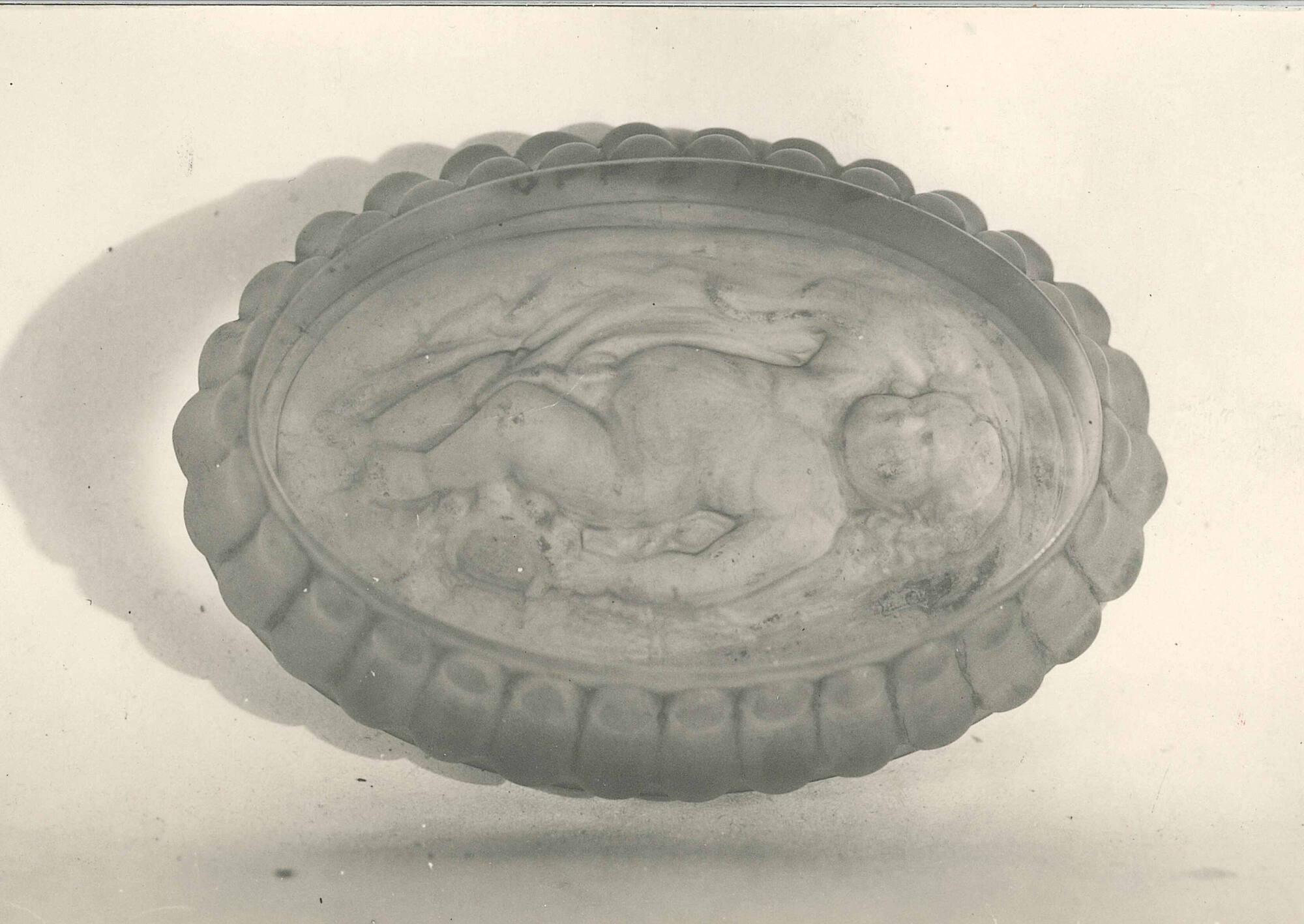 DescriptionPressed upside down in a one-piece female mold by a male plunger bearing the pattern of a cherub and drapery. Sides and back acid etched to produce the matte finish. Top ground and polished. Colorless glass.