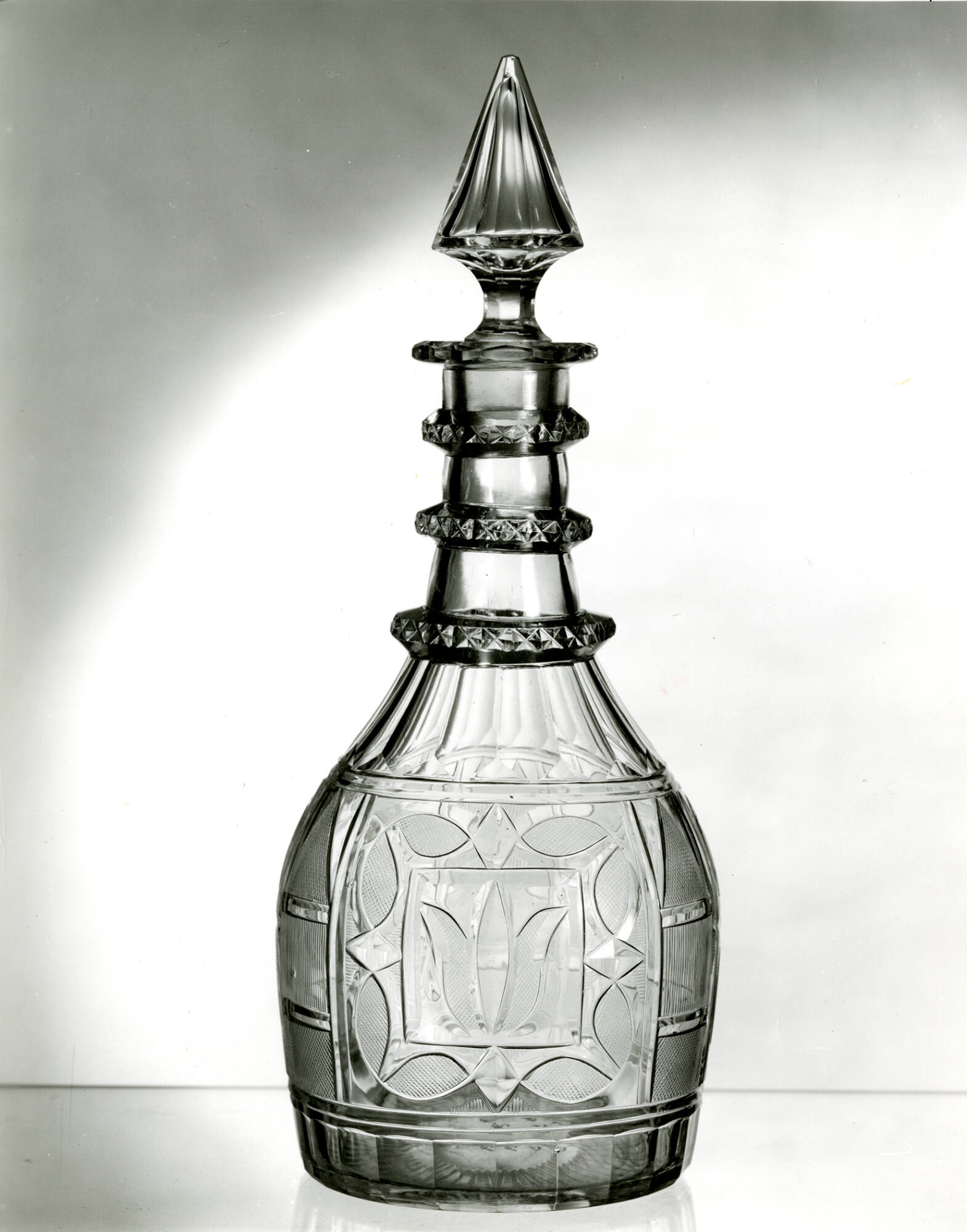 DescriptionBody decorated with three panels, each consisting of a cut and engraved stylized tulip within a square frame surrounded by a series of vesica and diamond motifs, the outer petals of the tulip and the vesicas filled with cross-hatched decoration, all within another square frame. Between the frames the body is decorated with vertical panels of fine cross-hatching and vertical lines. Lower part of body and shoulder cut with flats. Neck rings cut with hob diamonds. Edge of lip cut with a series of elongated horizontal hexagons. The 4.5 cm (1 3/4 in.) diameter polished pontil mark is surrounded by forty-two cut narrow rays that extend to the outer edge of the base. Upper part of stopper cut with eight flat tapered panels that extend downward to the shank. Shank ground and polished to fit the ground and polished neck of the decanter. Colorless non-lead glass. Decanter: blown and finished by tooling. Three applied and tooled neck rings. Applied and tooled narrow flange lip. Polished pontil mark. Stopper: blown and finished by tooling.