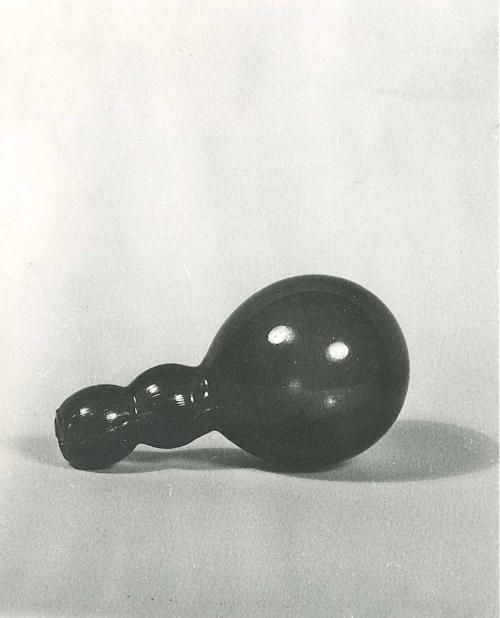 DescriptionBlown and tooled to shape. Cracked off blowpipe, leaving hole and rough surface on end. Bluish-green, non-lead glass.